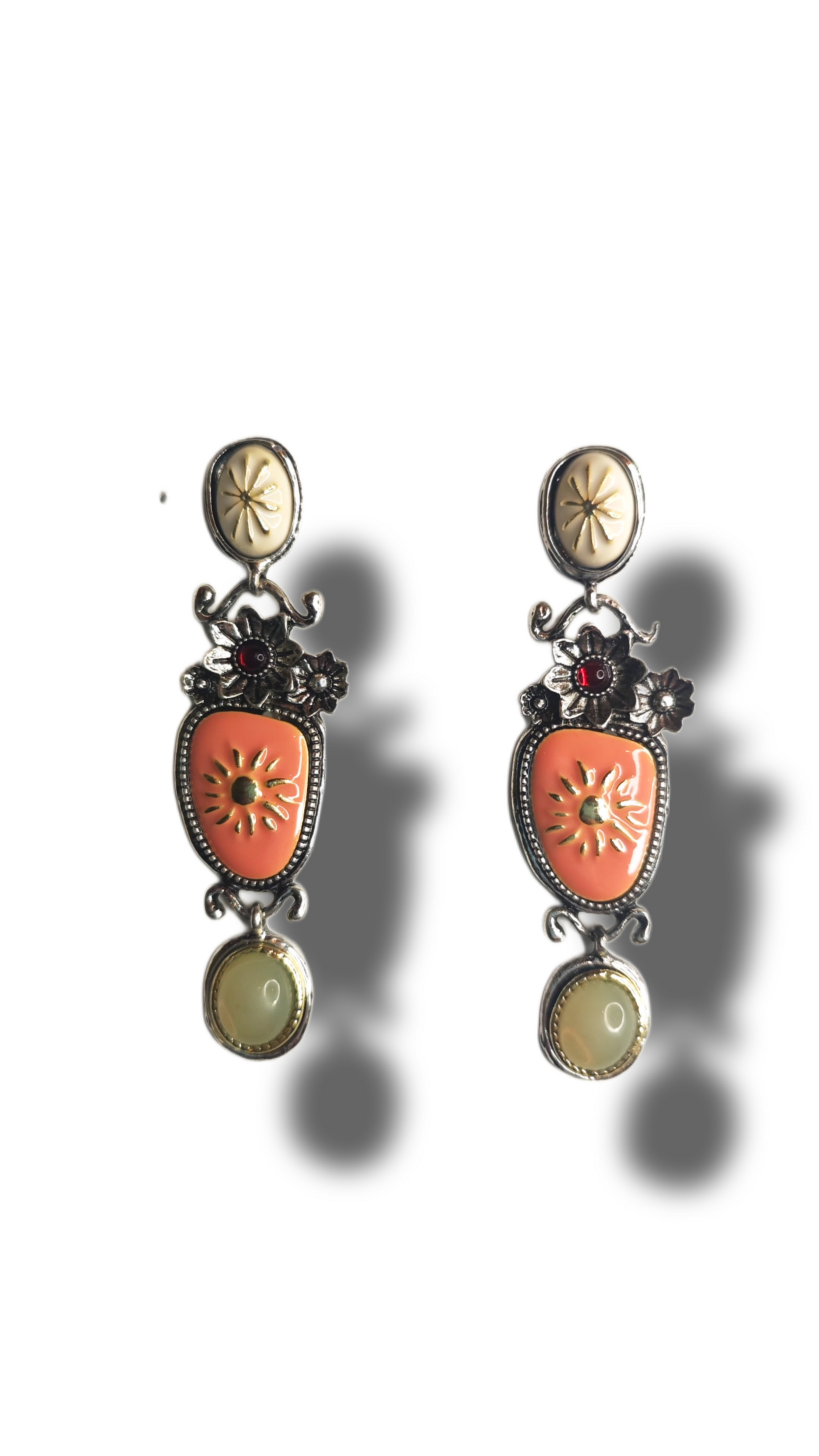 Una pieza de diseño maximalista que captura la esencia del arte folclórico. Con una vibrante combinación de tonos coral, blanco y amarillo, estos aretes colgantes estan diseñados para ser la pieza favorita de tus accesorios.