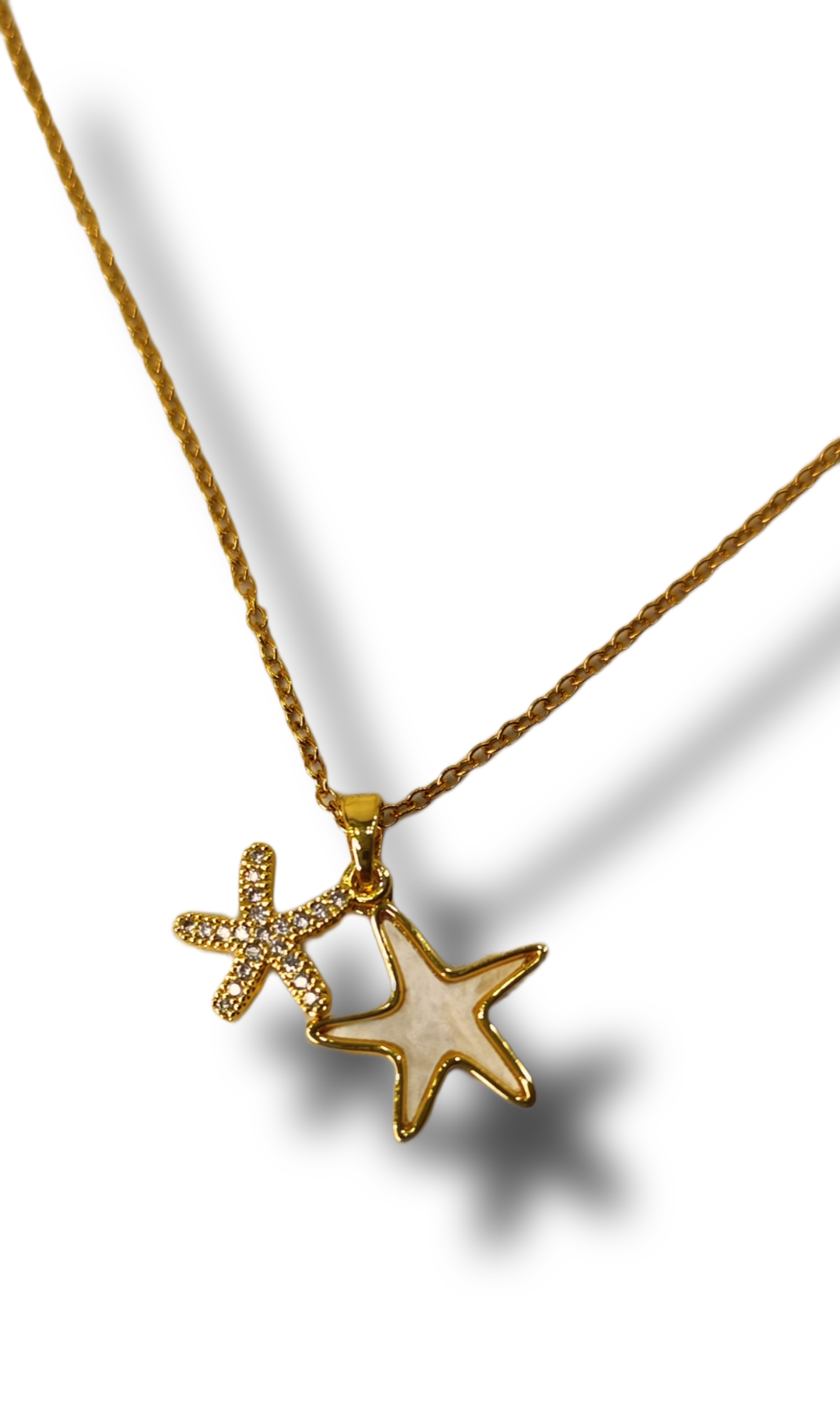 Este collar con dije de estrella de mar, combina los cristales con los detalles perlados que lo hace en un dije playero y discreto.