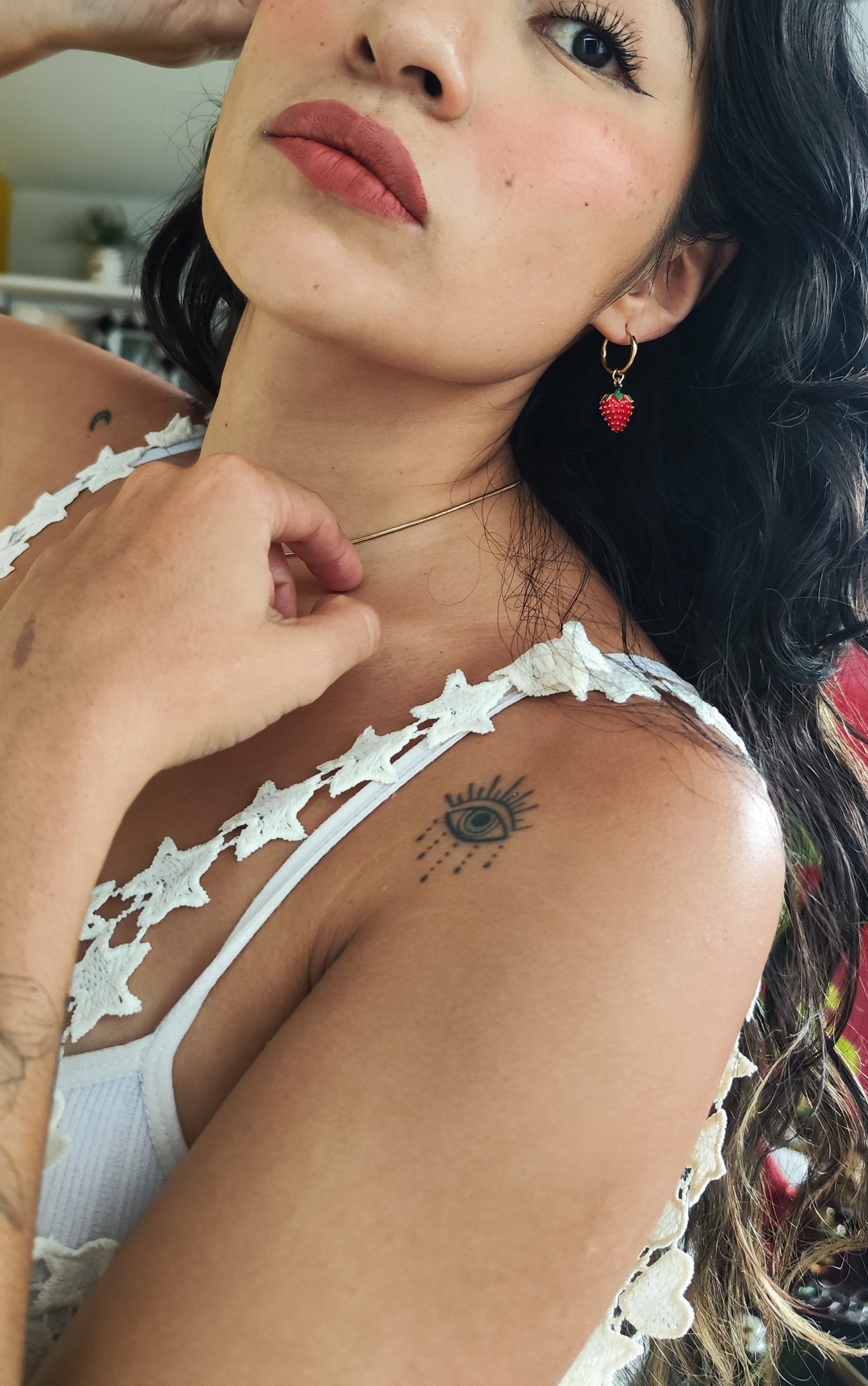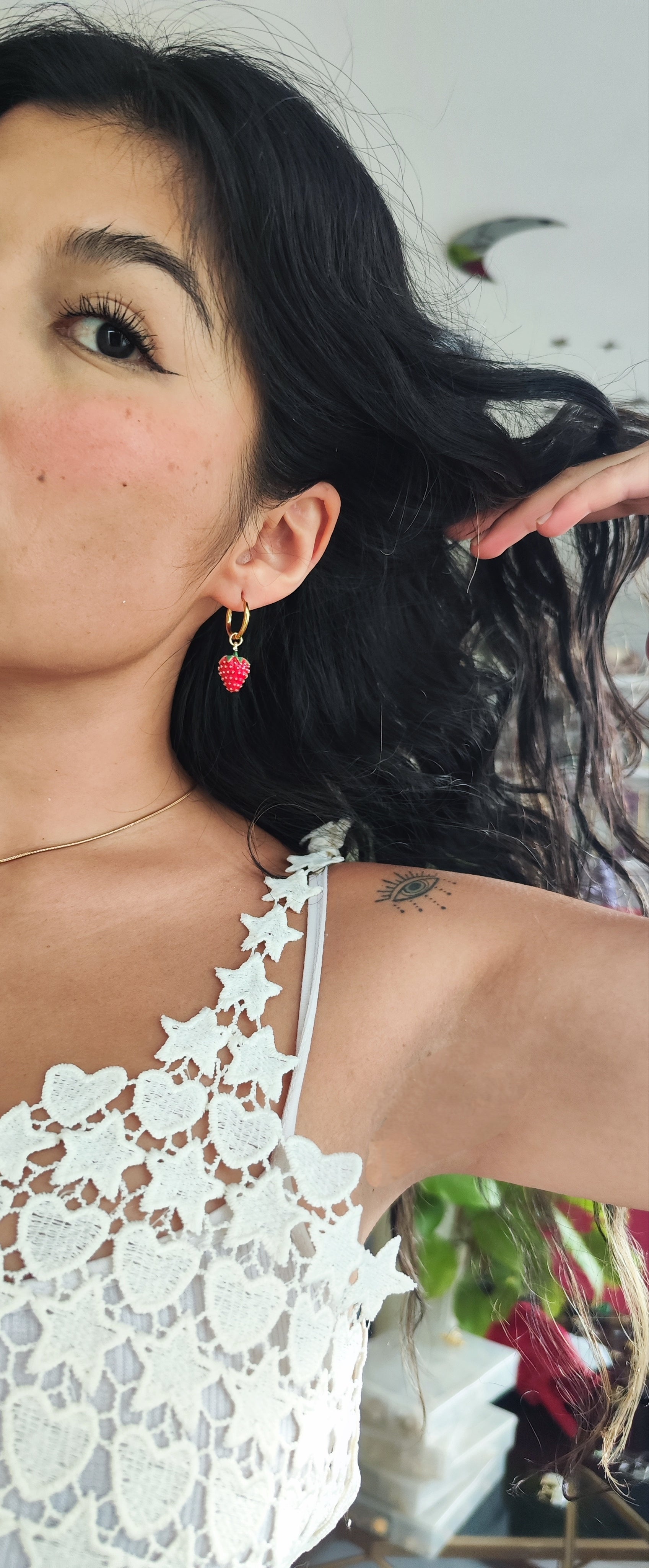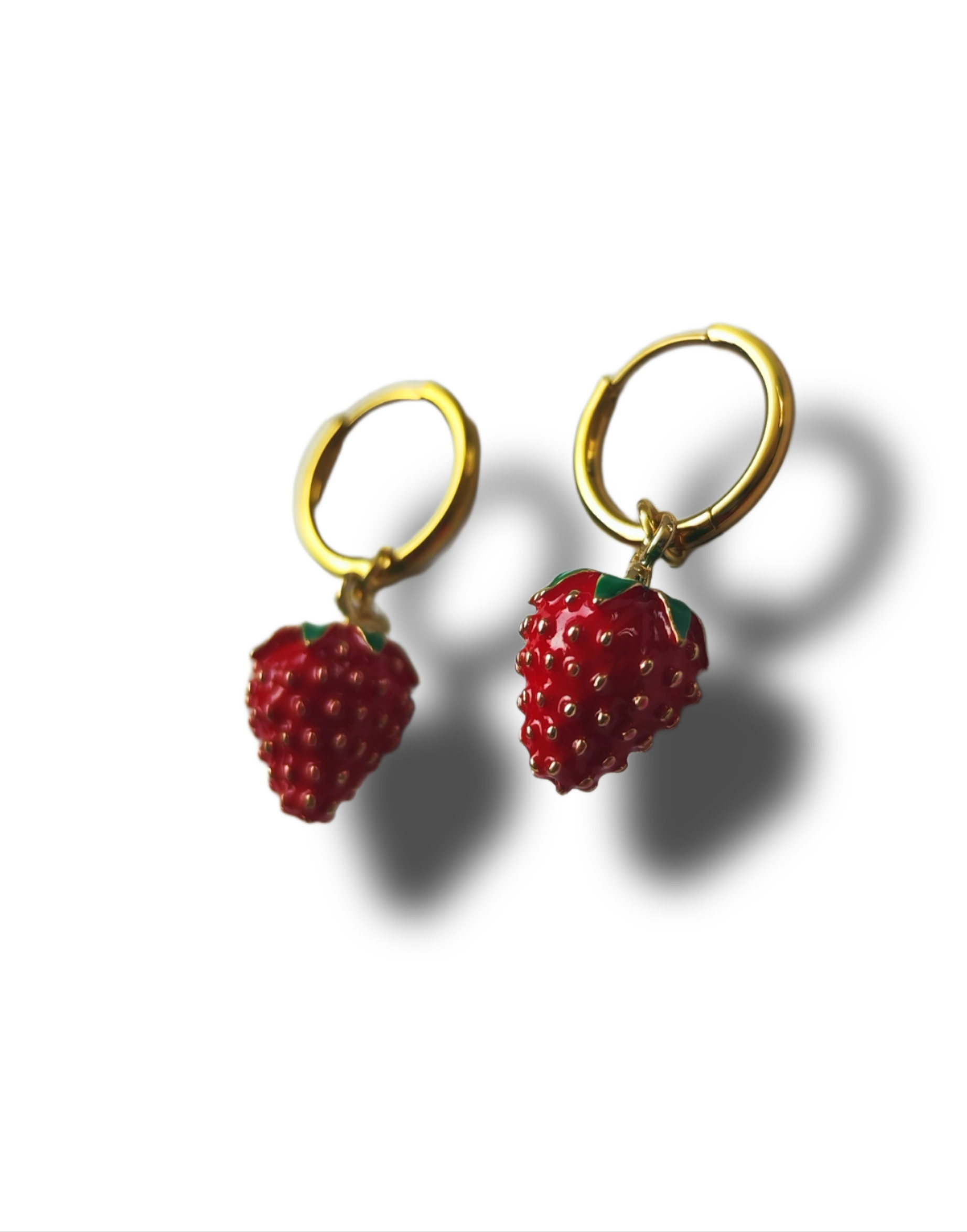 los hoops mas cómodos y coquetos, deben ser estos. Los detalles de la fresita en 3D es hermoso, un toque pop y de color a tu colección de joyeria.